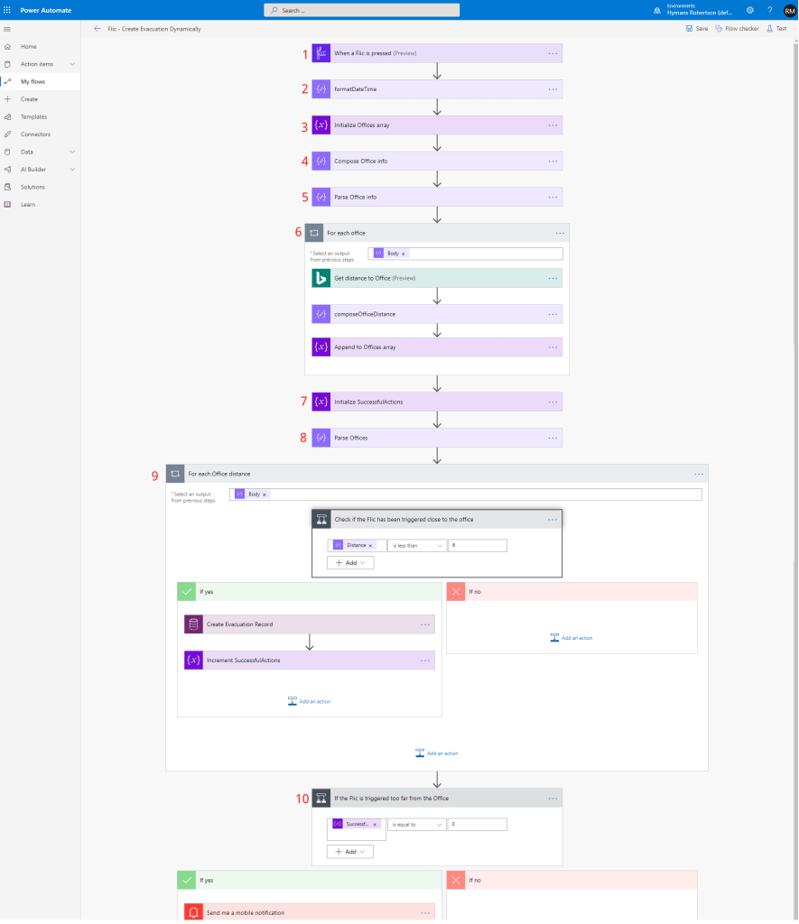 9. For Each Office Distance loop – in this loop we’re going to be checking if the Flic has been triggered within a set distance of any of the offices, and if so we’ll be creating a new evacuation record