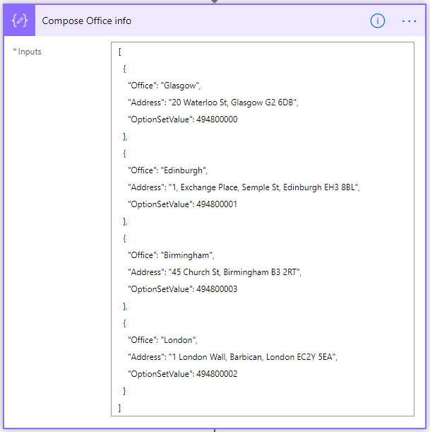 4. Compose Office Info – In this Compose action I’m inputting an array that includes the Office location, the Office address, and the Option Set Value that corresponds to the office