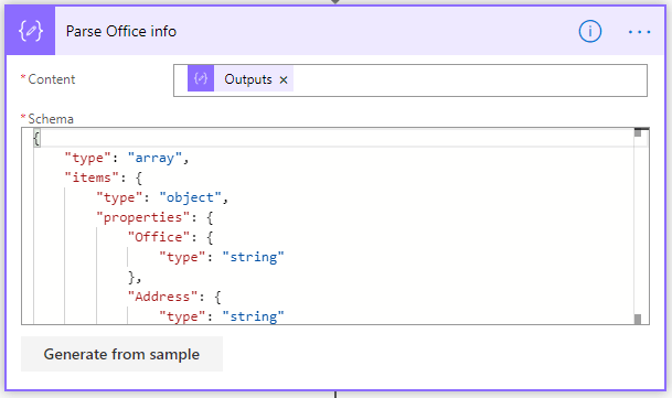 5. Parse Office Info – I’m using a Parse JSON action to parse the array I created in the previous step, using the following schema