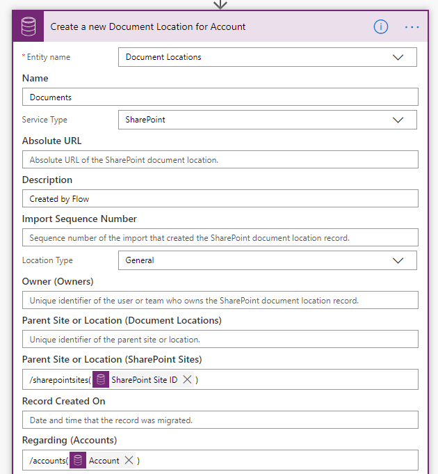4. List Document Locations related to Account – next we want to retrieve all of the related Document Locations for the Account as each Document Location represents a SharePoint Document Library, so we’ll use a List Records action with the following filter query: